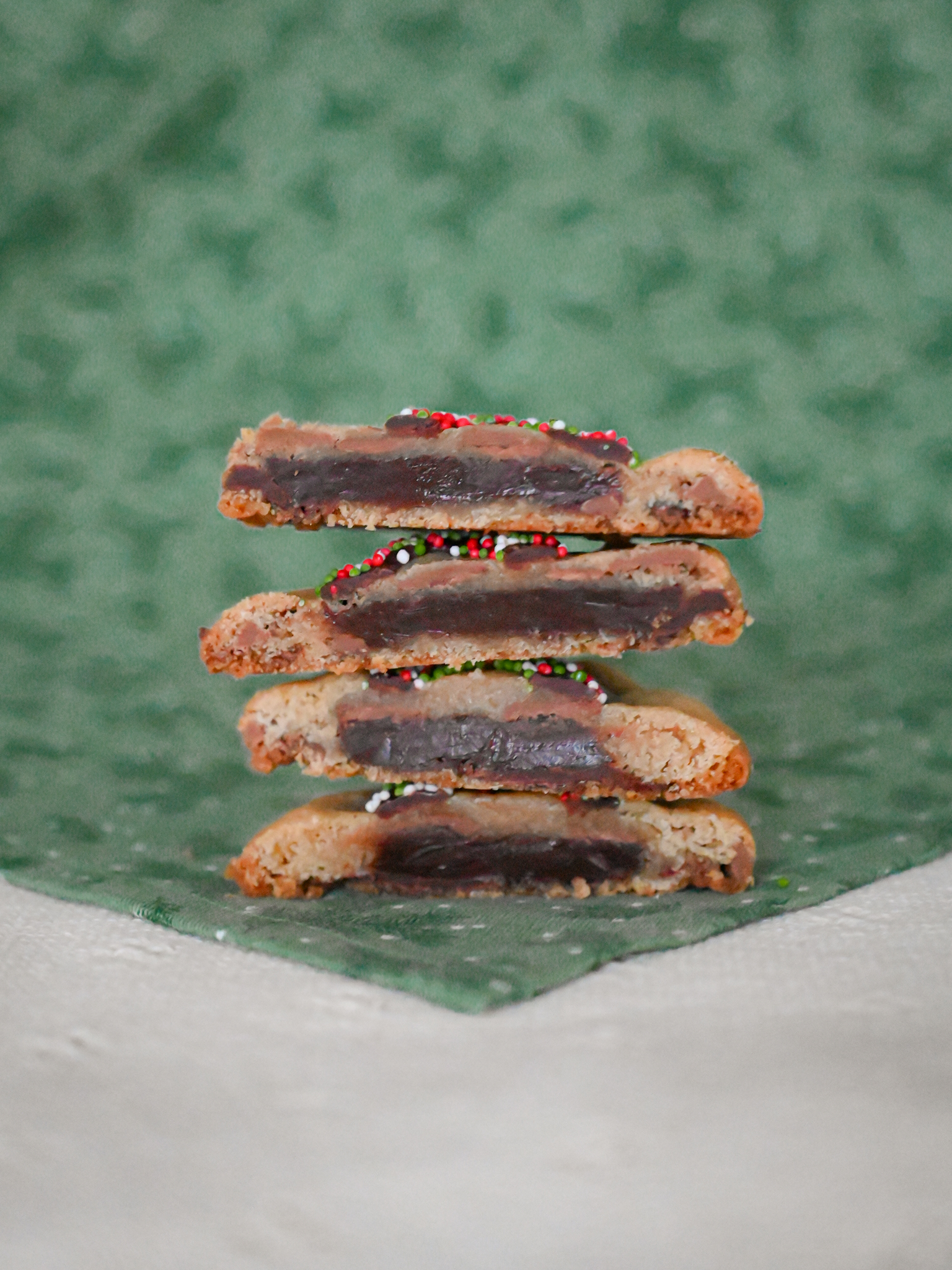 Ingrediënten: tarwebloem (gluten), roomboter (lactose), ei, suiker, vanille-extract, zout, fudgevulling en chocolade.